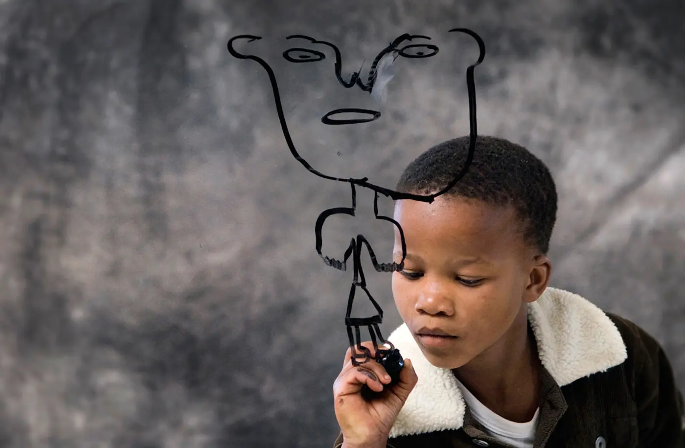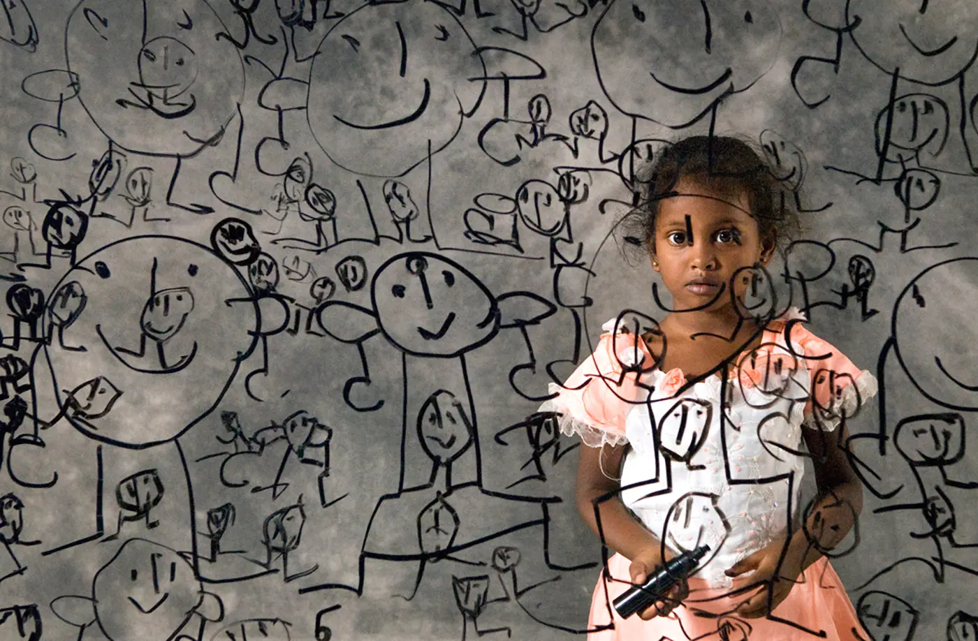 C’est le voyage d’une vitre autour de la planète qui propose à des enfants qui ne savent ni lire ni écrire de s’emparer d’une place dans le cadre à l’aide d’un simple autoportrait…C’est une traversée qui commence avec la naissance d’un « bonhomme » et qui se termine avec l’apparition des mots…C’est l’histoire de chacun de nous, de ce que nous avons été, et de la difficulté de le rester…